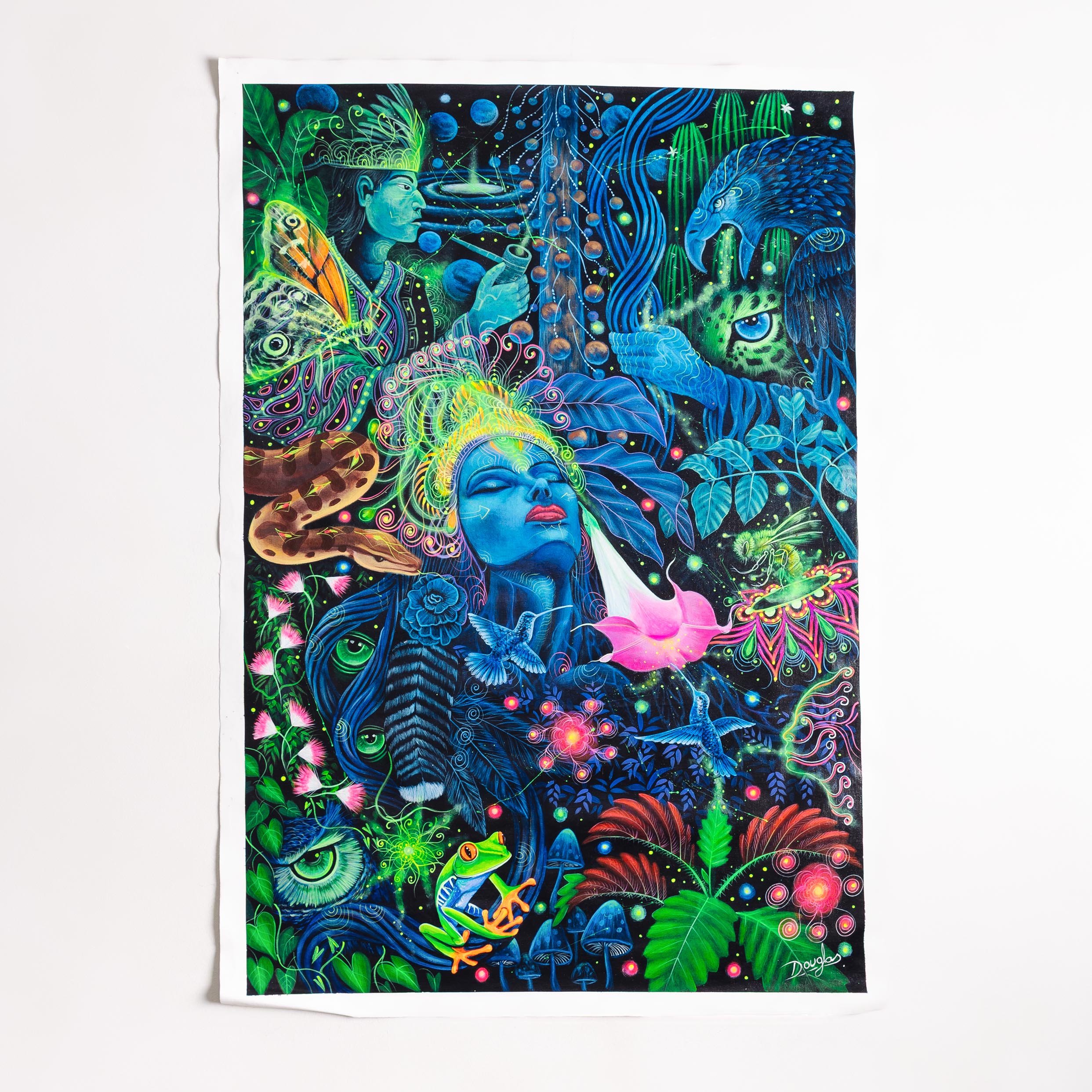 Эта яркая и мистическая картина из Перу переносит в мир амазонского шаманизма и видений, рождающихся в глубине джунглей. На полотне переплетаются образы духов растений, силы животных и магия природы: шаман, испускающий священный дым, женщина в состоянии медитации, птицы, бабочки и священные лягушки Камбо.