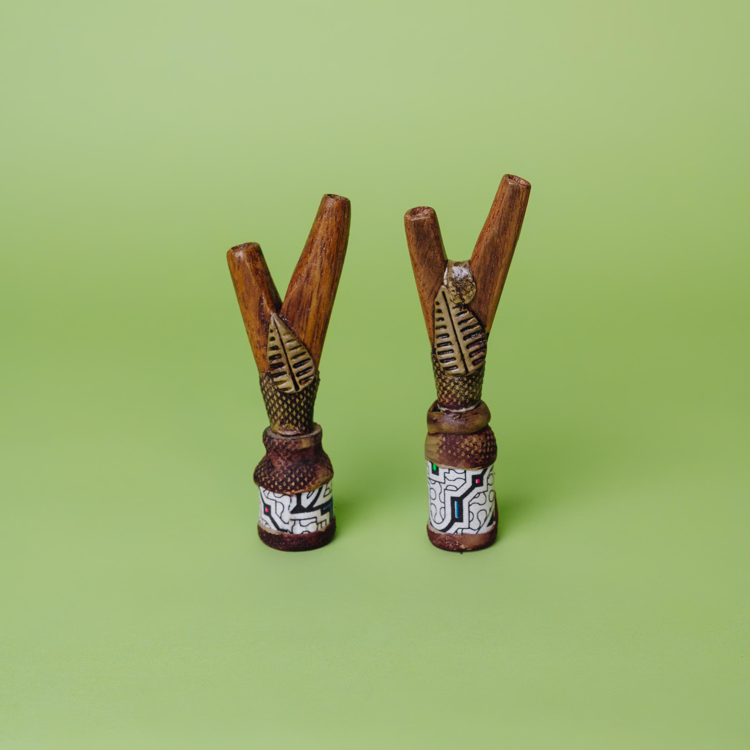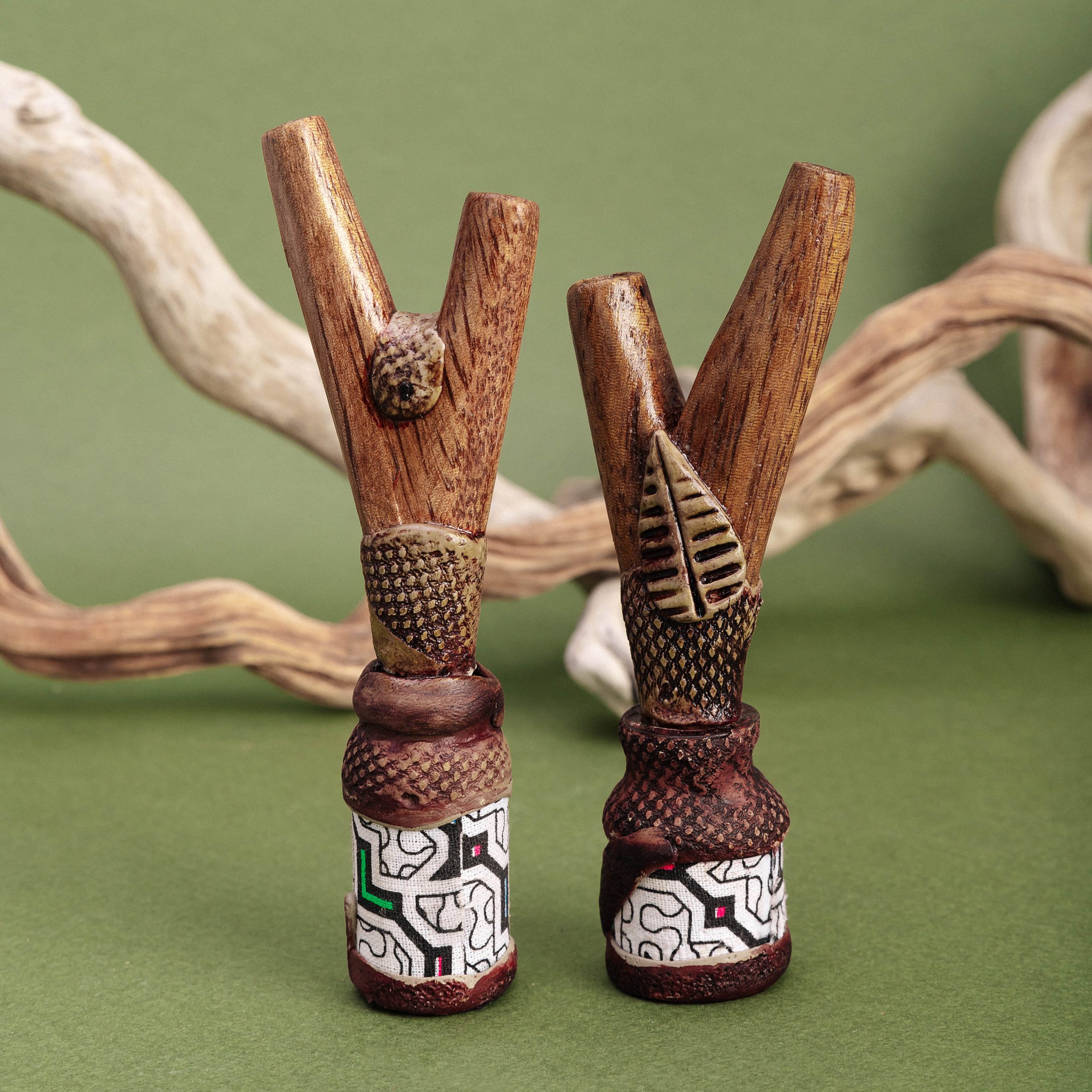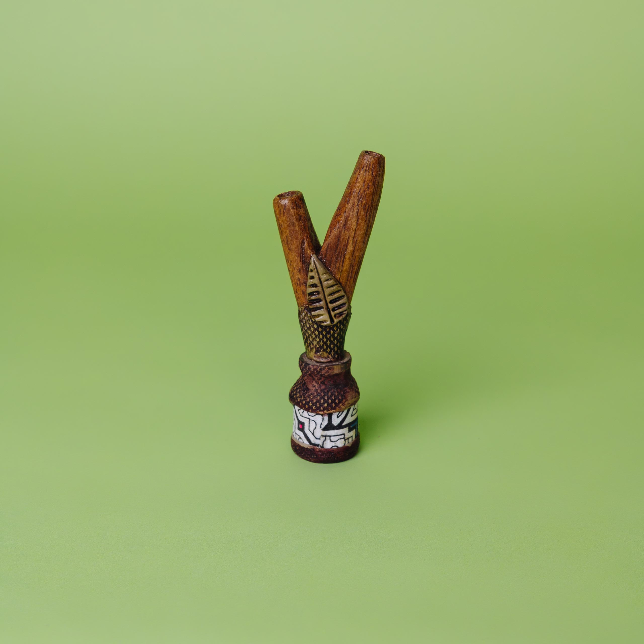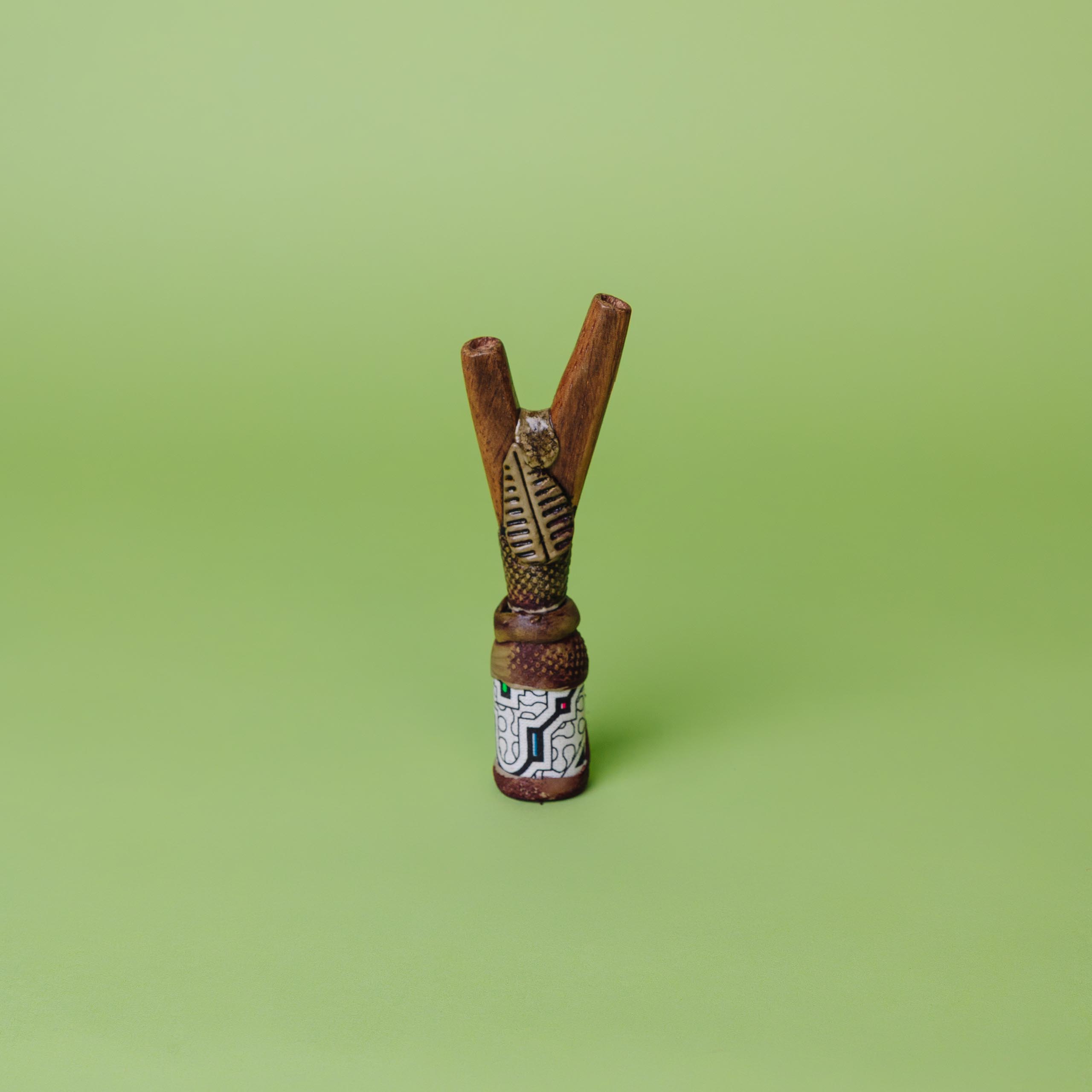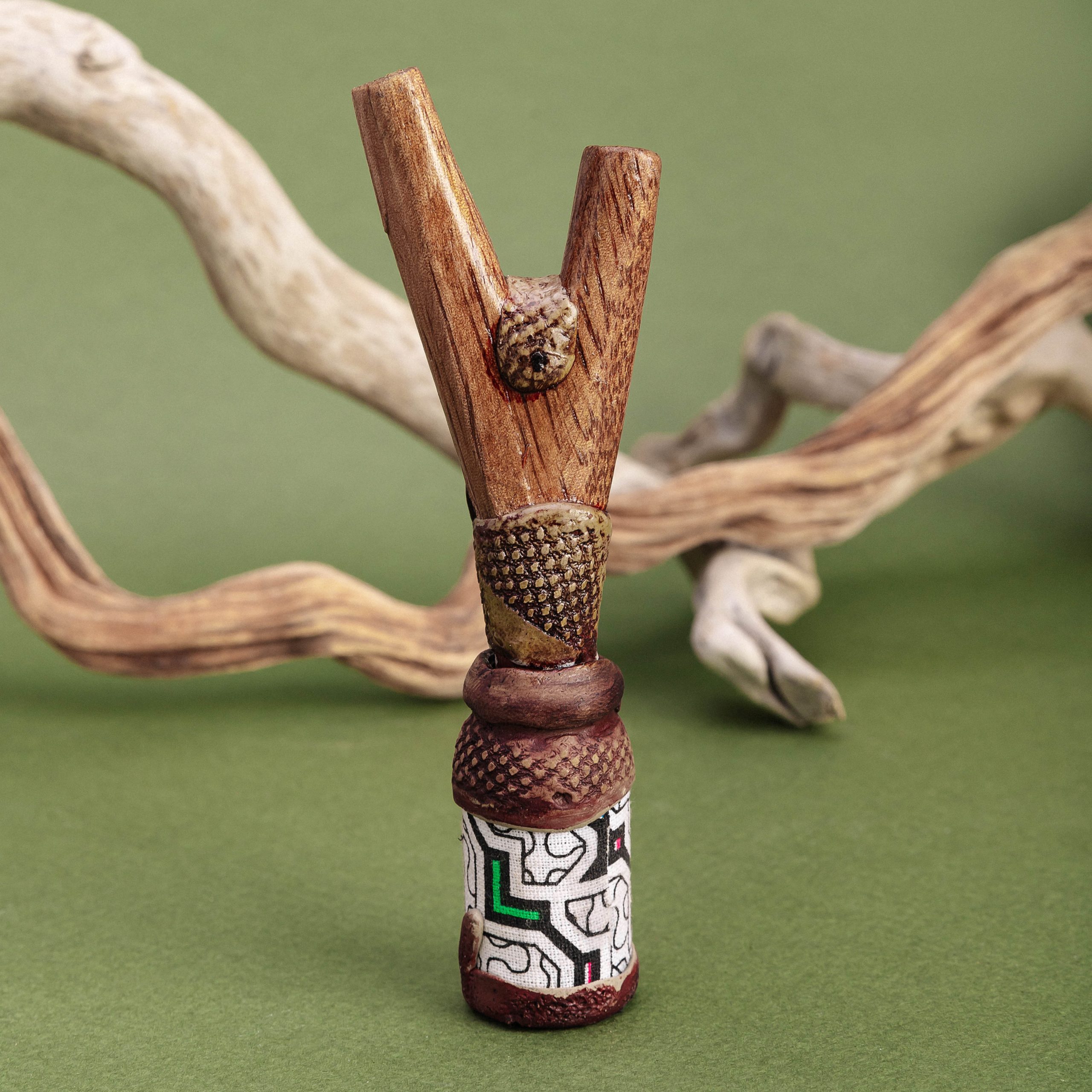 Инструмент для ритуалов Камбо, созданный мастерами Амазонии, сочетает традиции и функциональность. Флакон используется для безопасного введения растительных эссенций, поддерживая духовную практику и очищение.