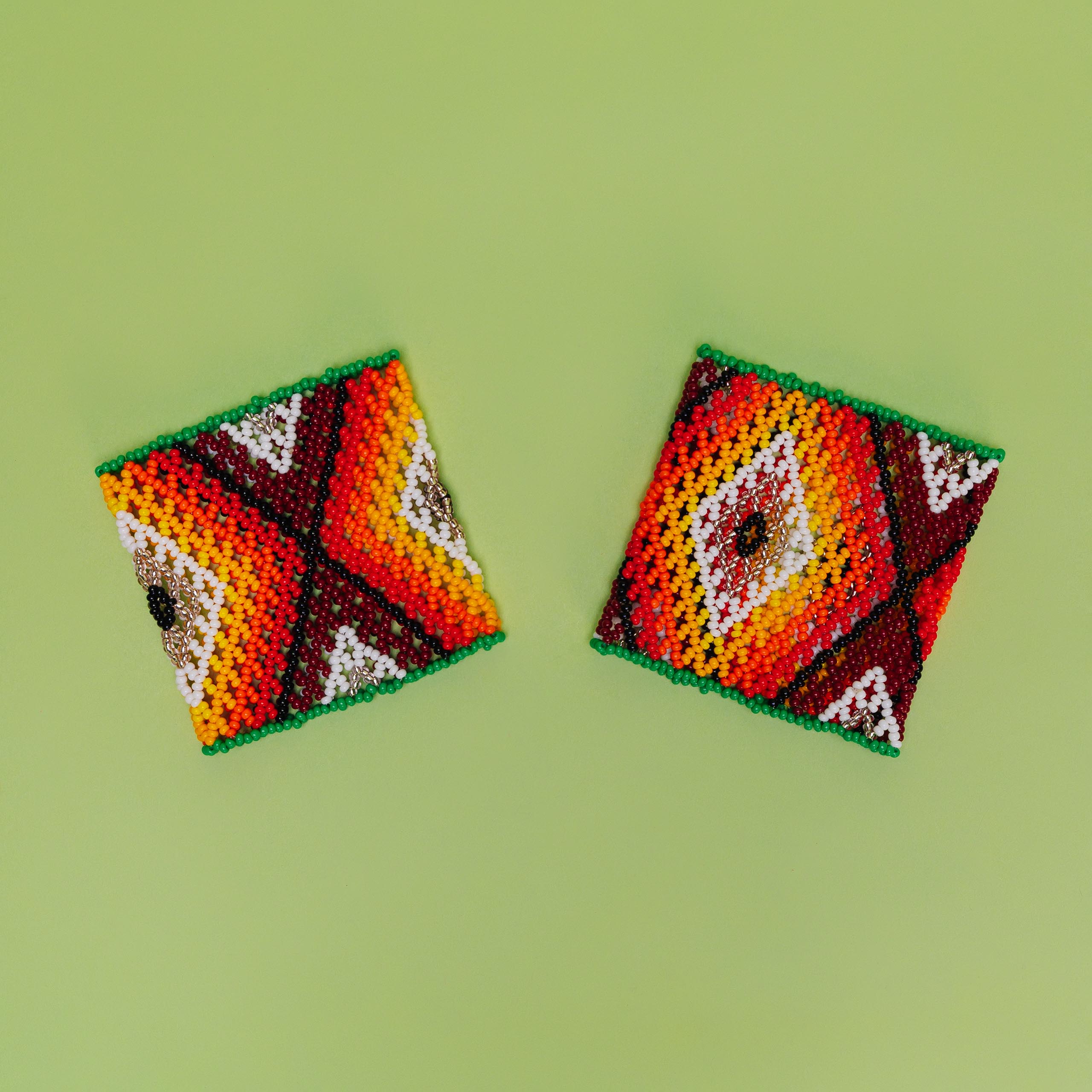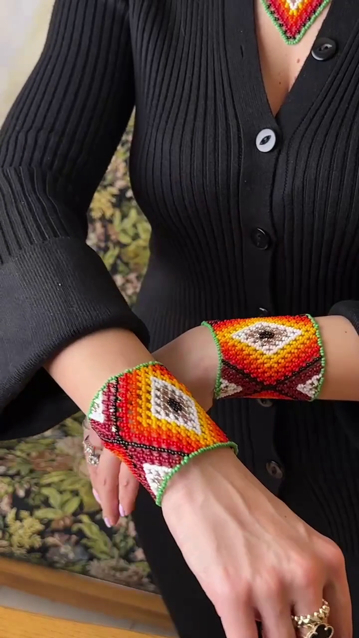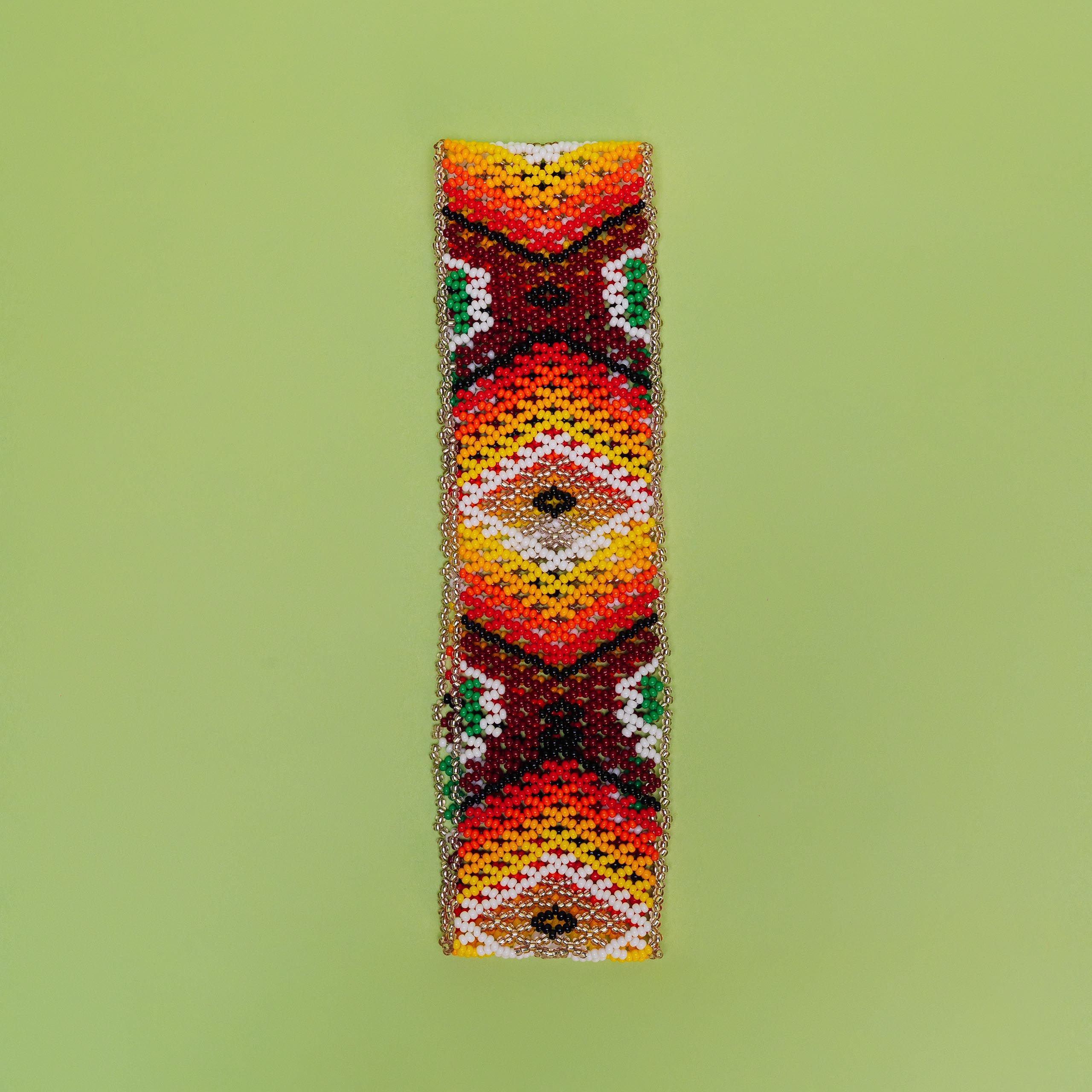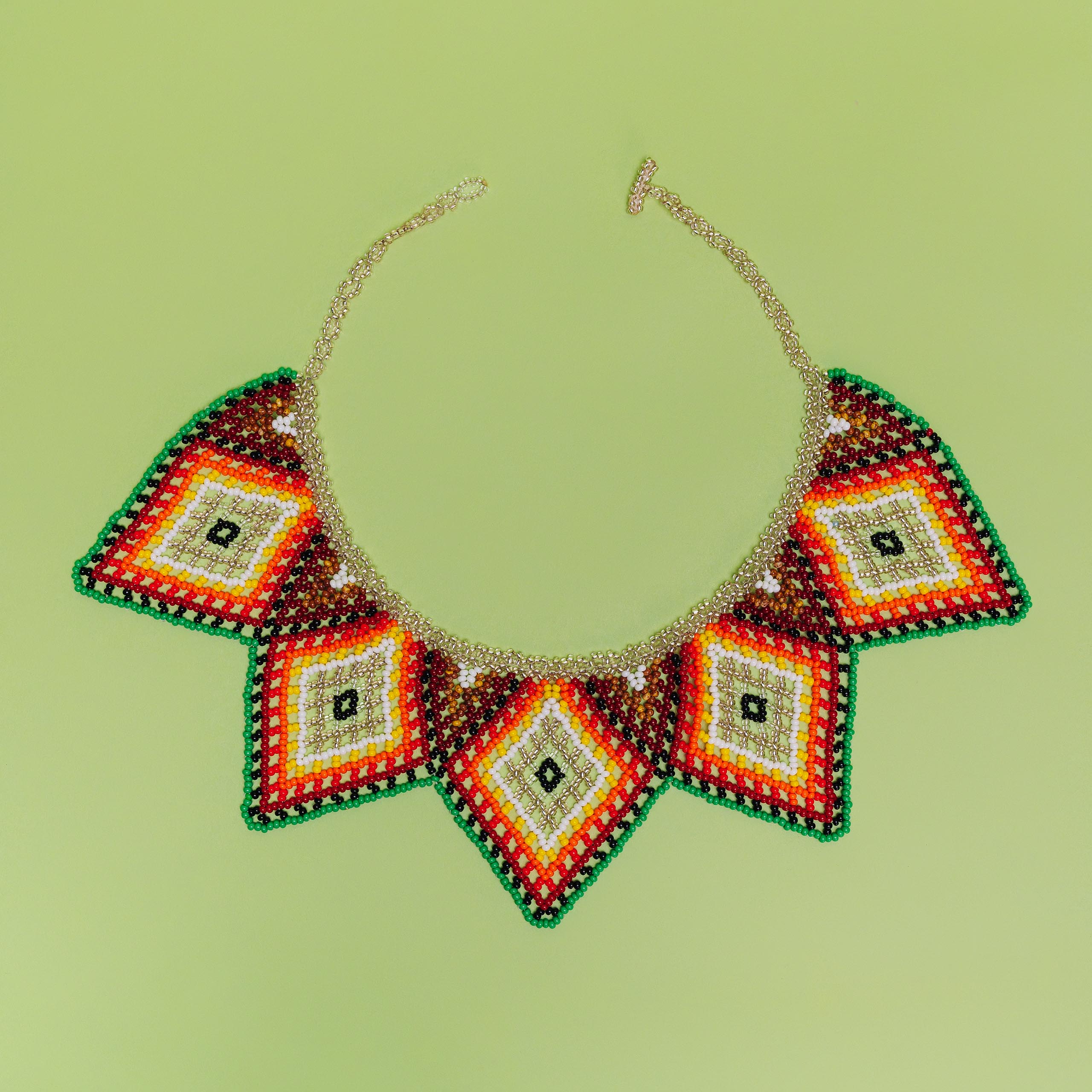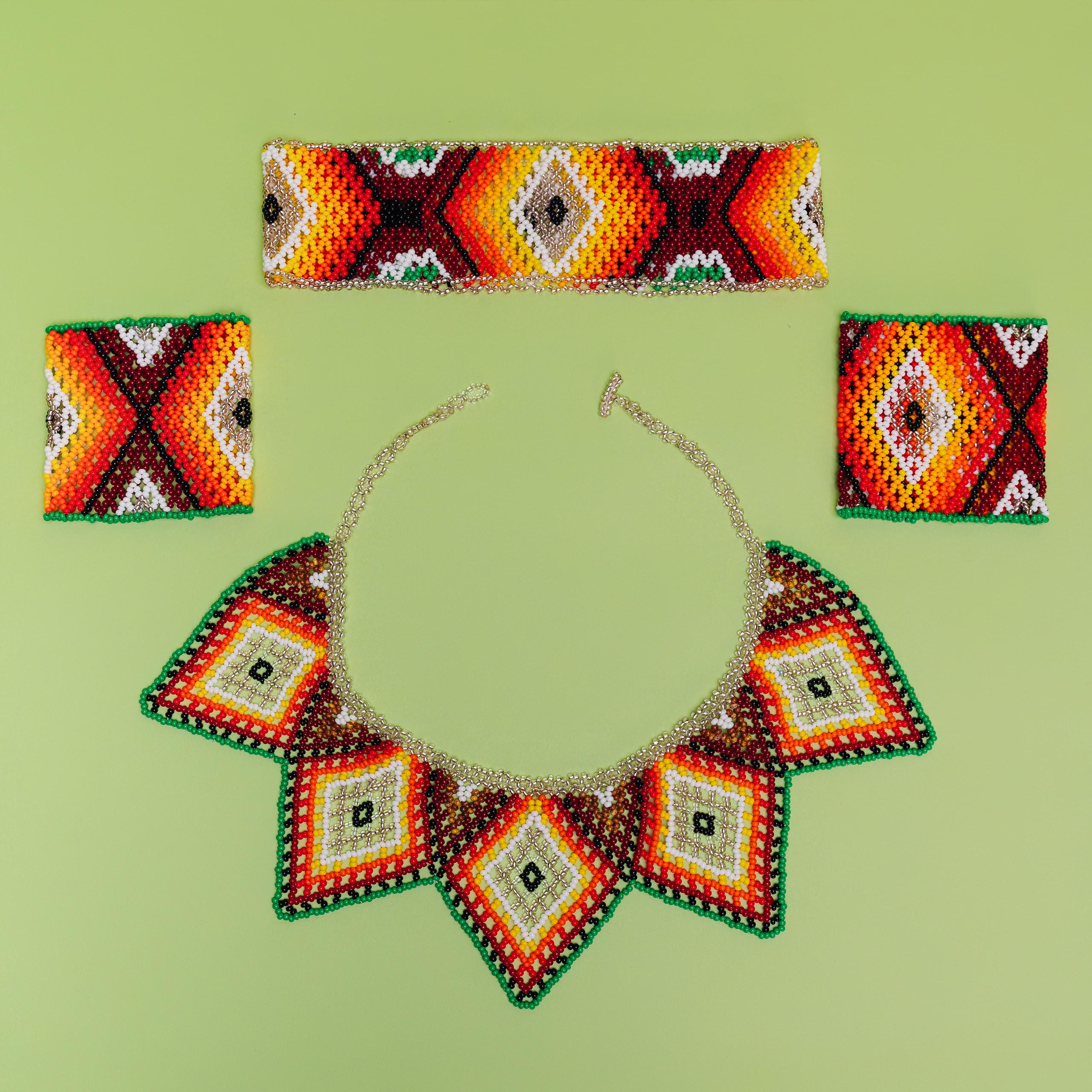 Этот набор украшений создан мастерами народа Хуни Куин и отражает богатую культуру Амазонии. Каждый элемент украшен традиционными узорами и яркими цветами, символизирующими гармонию, силу и связь с природой.