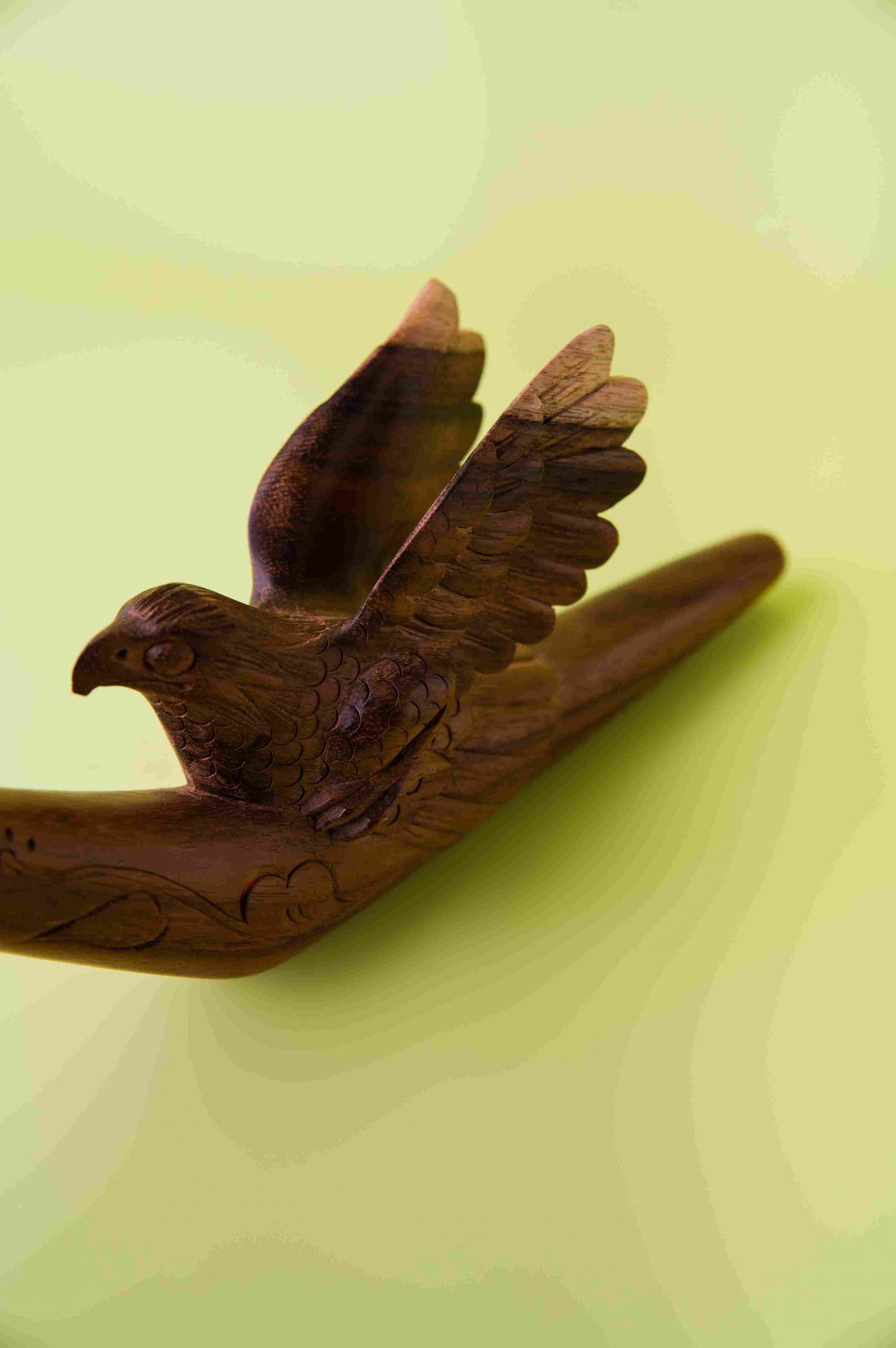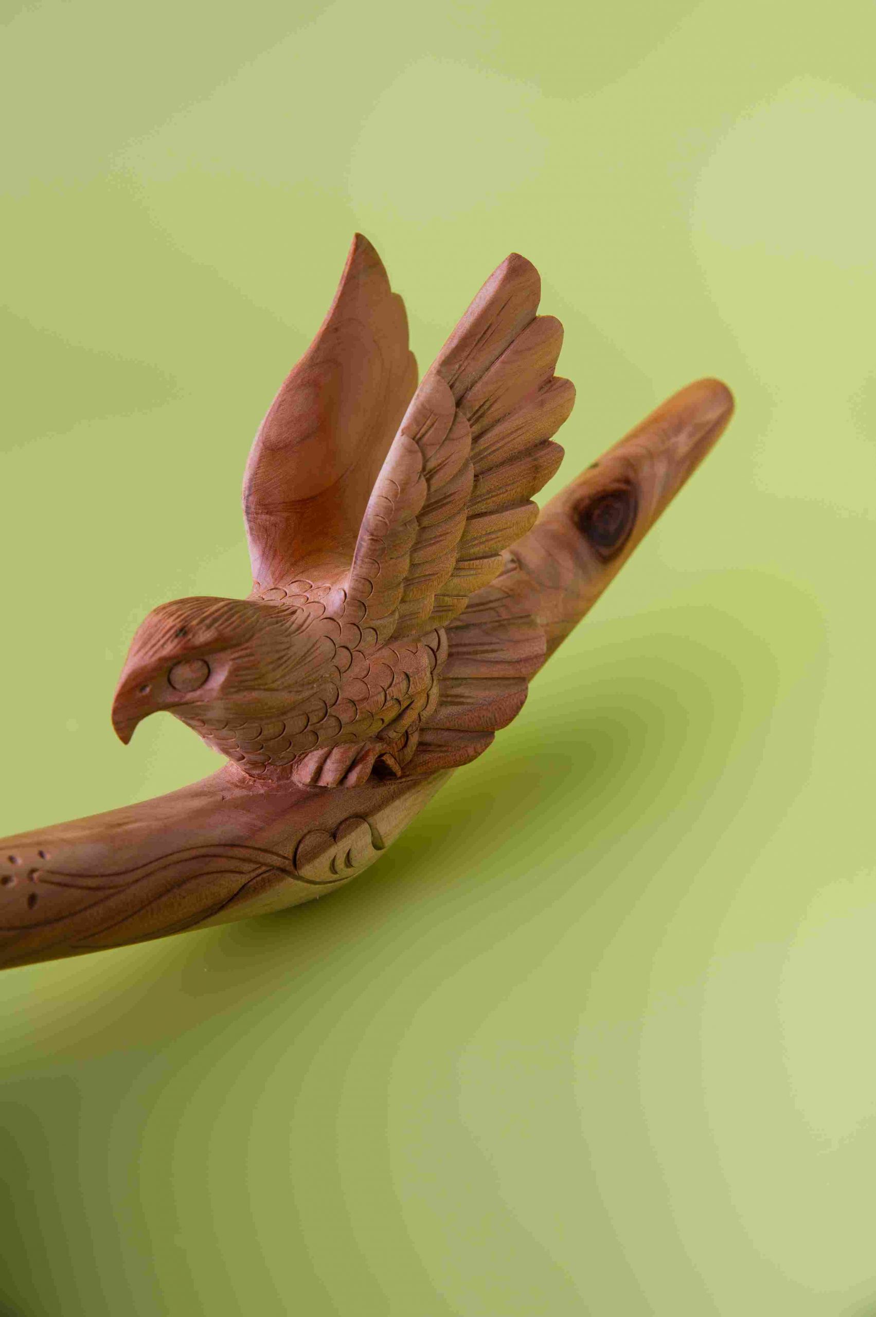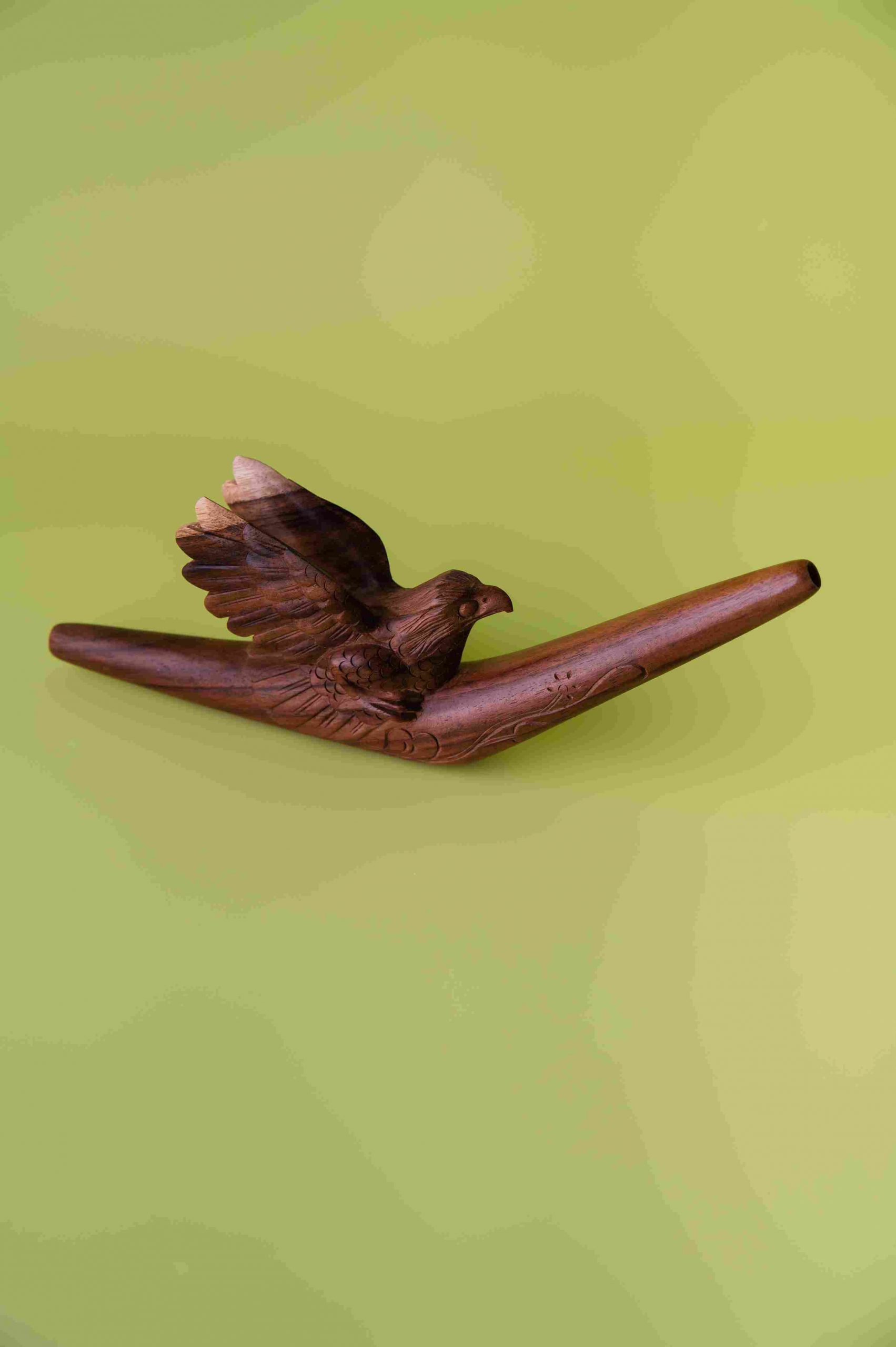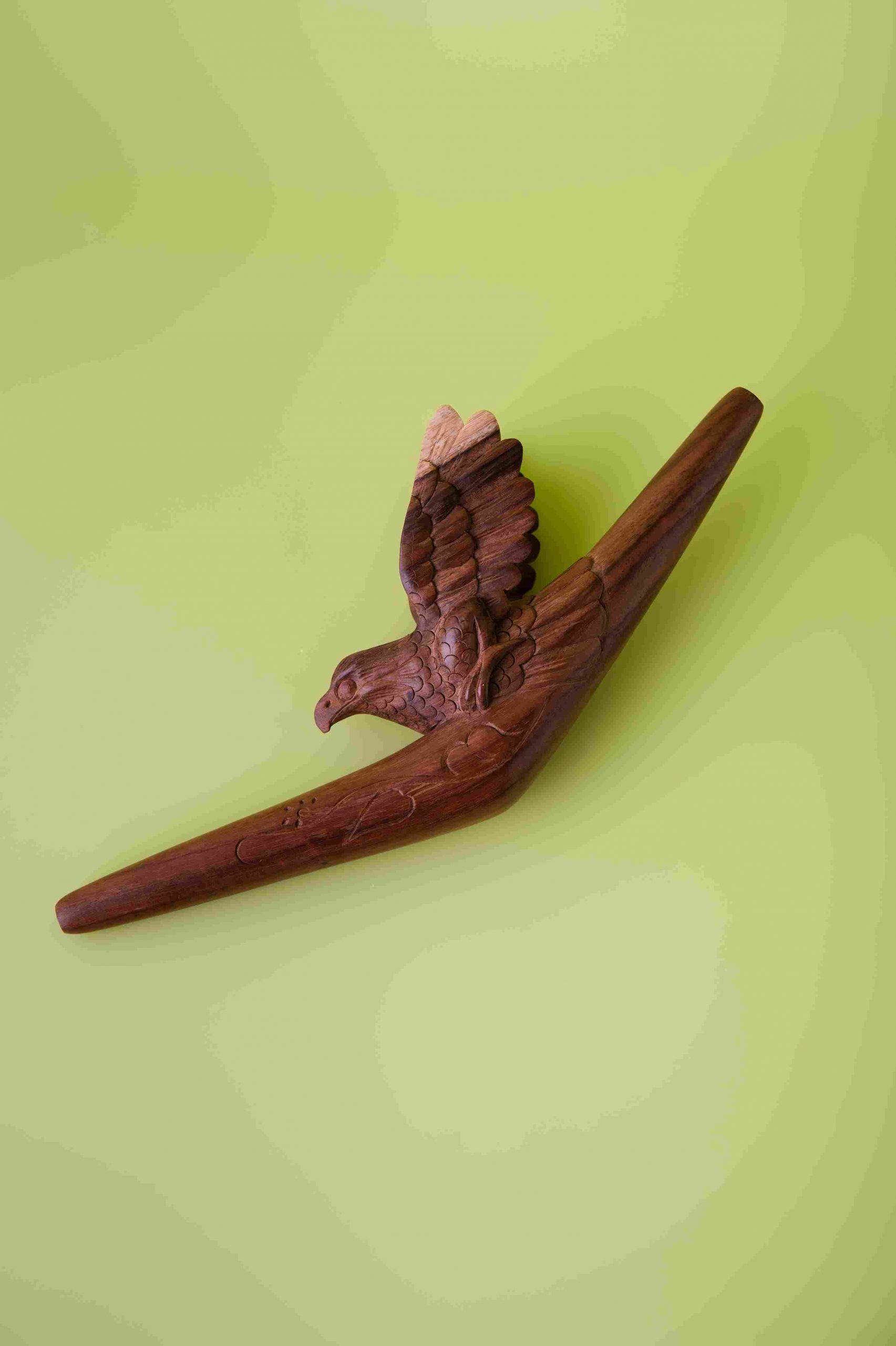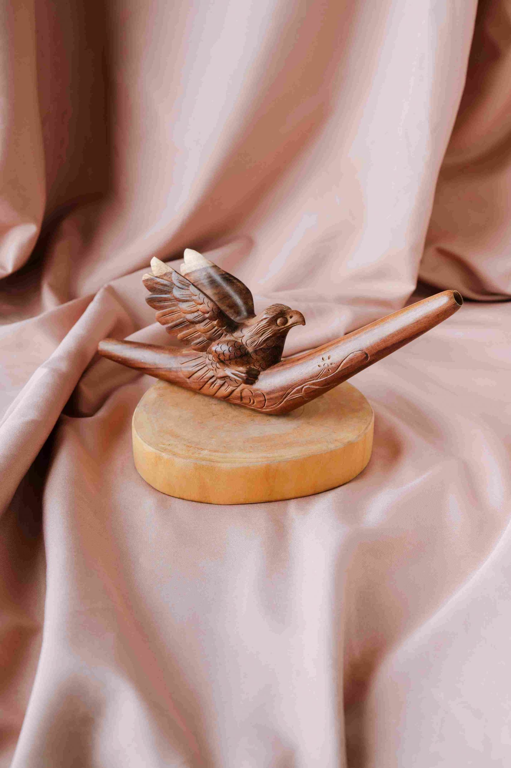 Эта трубка Tepi вырезана из цельного блока дерева с комбинированием разных пород, создавая неповторимый рисунок и естественные оттенки. Изображение летающего орла символизирует свободу, силу духа и ясность видения, вдохновляя на внутреннюю уверенность и духовный полёт.